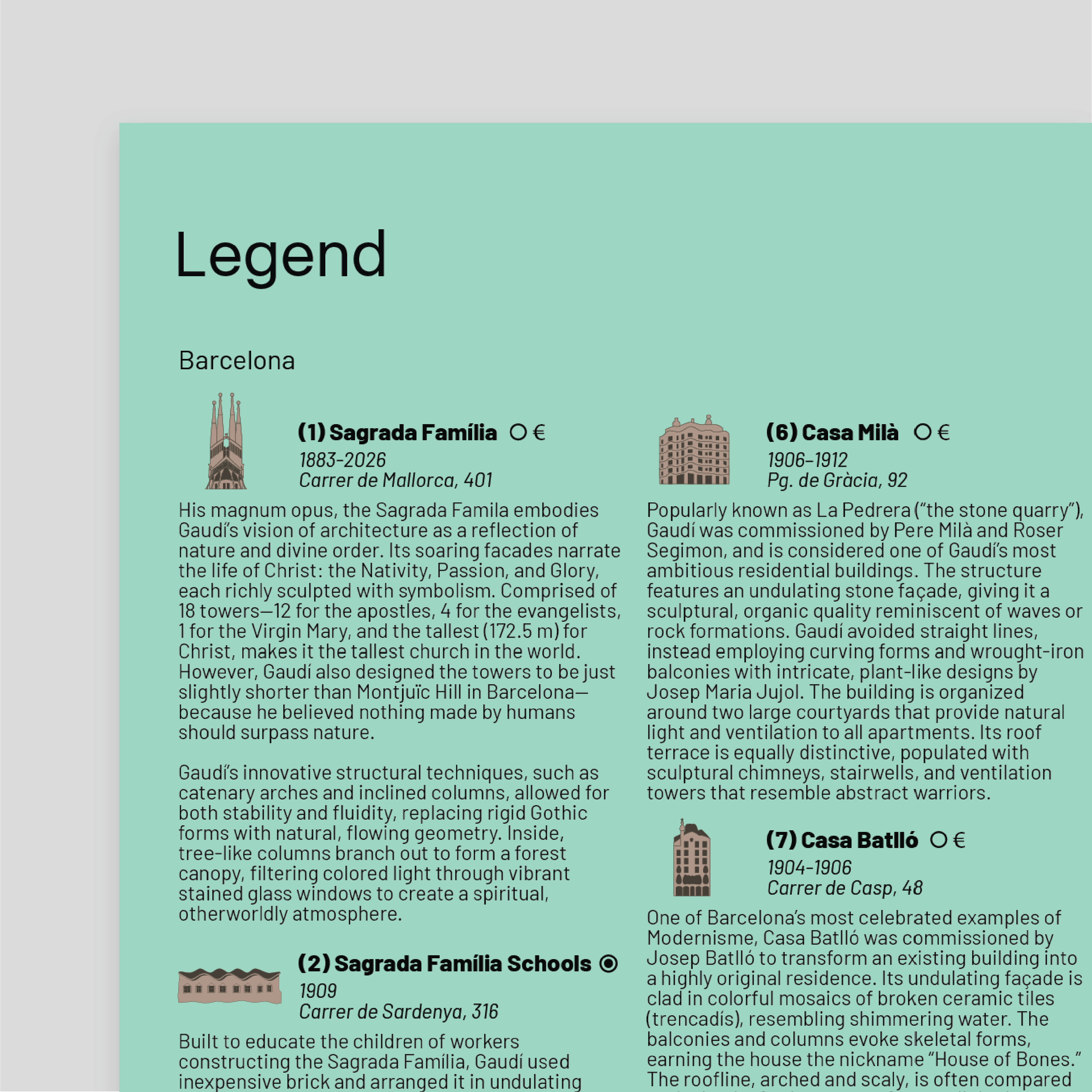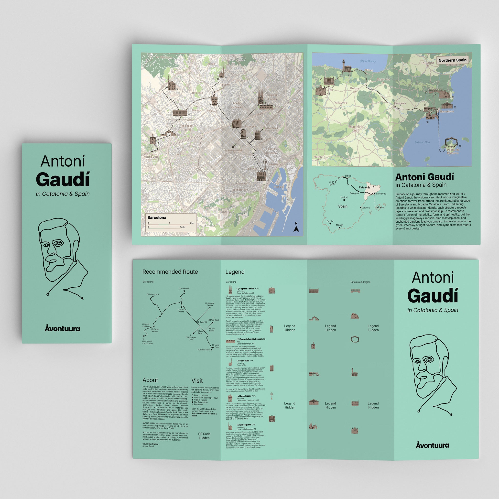 Embark on a journey through the imaginative world of Antoni Gaudí, whose visionary works transformed Barcelona and Catalonia. From the soaring spires of the Sagrada Família to the whimsical landscapes of Park Güell this two-sided folding map leads you through his masterpieces—including Casa Batlló and Casa Milà—revealing the poetic interplay of light, color, and form that define Catalan Modernism—perfect for travelers, culture lovers, and urban explorers alike.