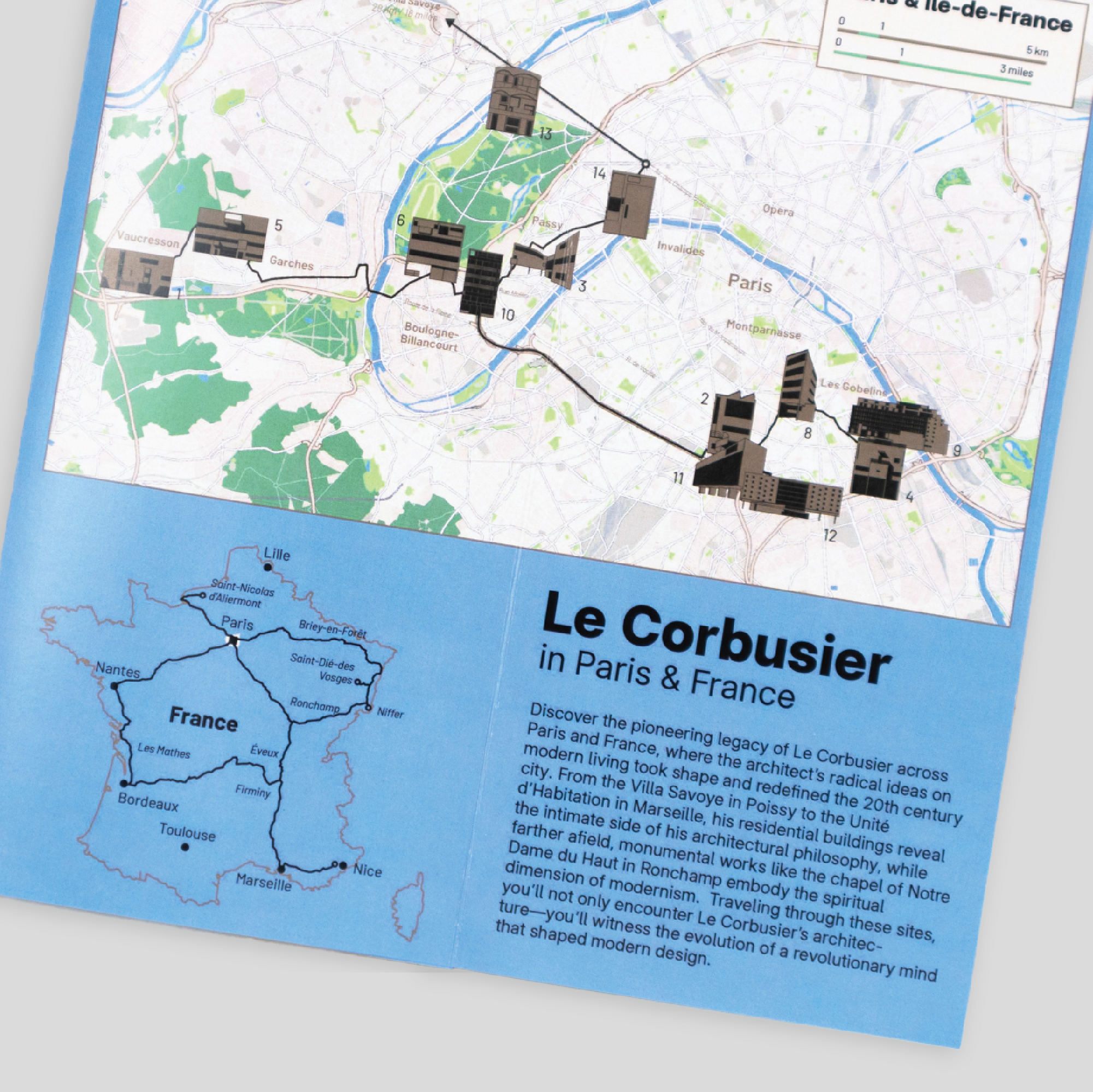 Each guide is centered on an illustrated three-fold map that pinpoints the locations of their projects. On the reverse, you’ll find a legend with each project’s name, a building icon, visiting information, and concise descriptions that deepen the architectural experience.