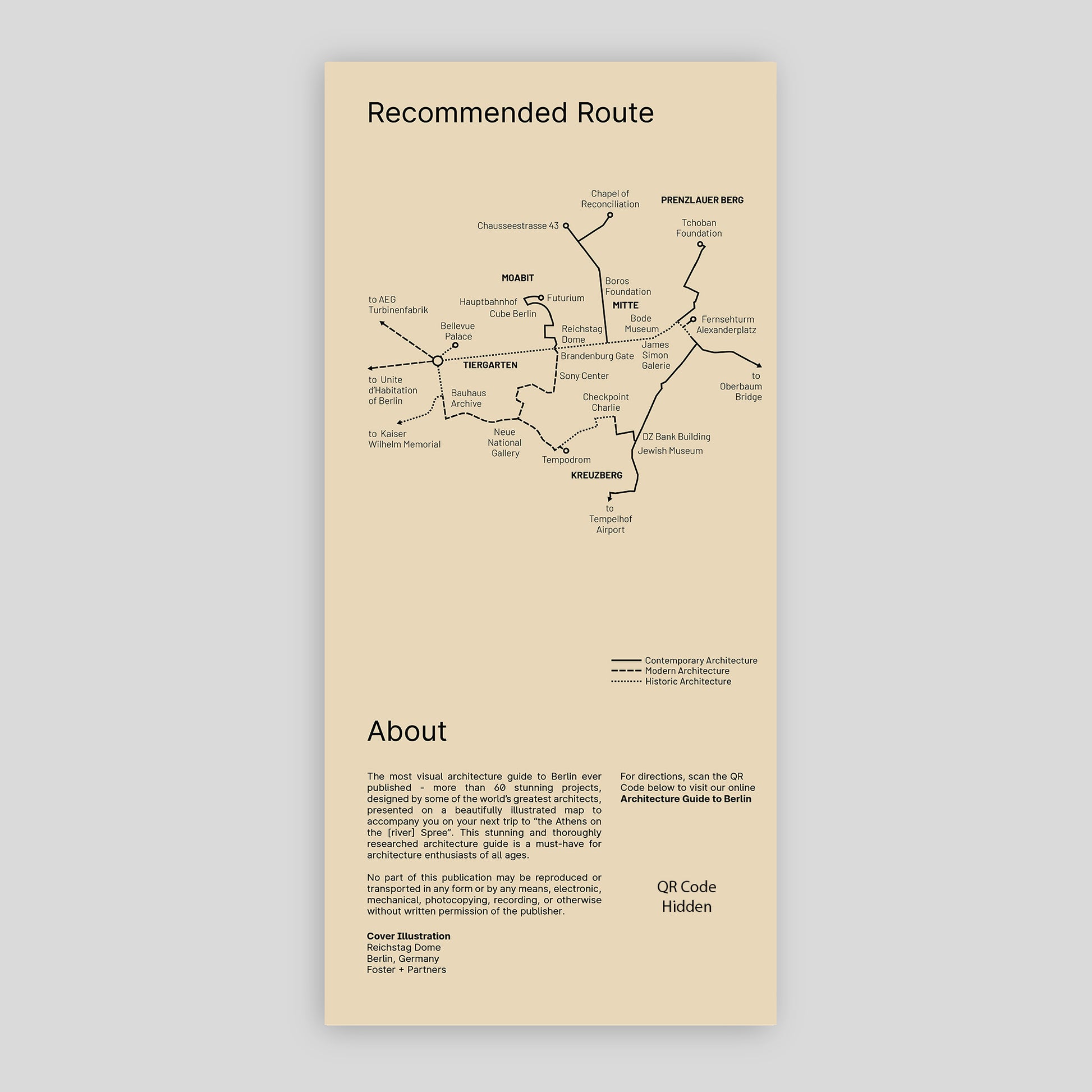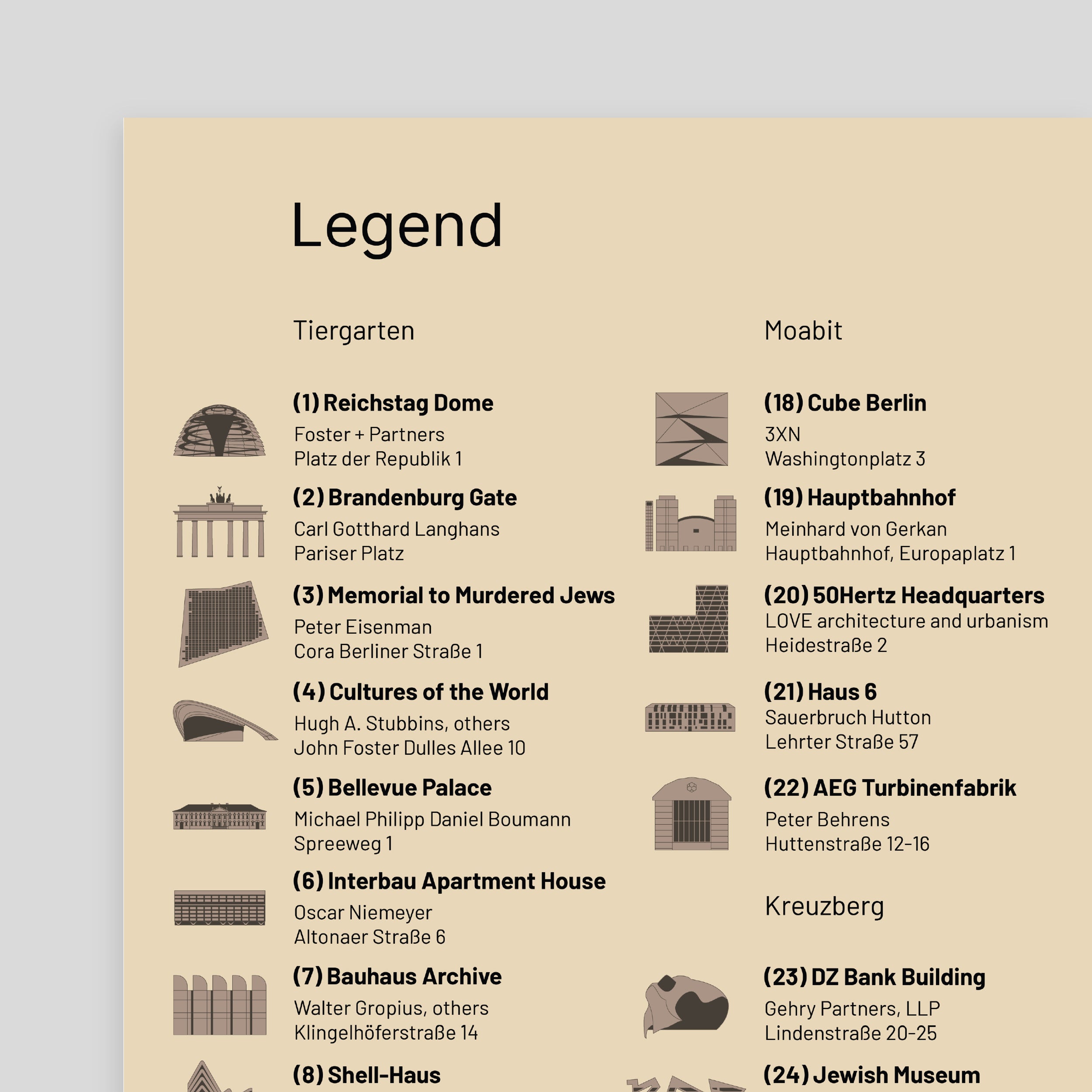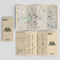 This two-sided folding map features over 60 illustrated building icons, ranging from historic landmarks like the Brandenburg Gate, modern masterpieces like the Neue National Gallery by Mies van der Rohe and Unité d'Habitation of Berlin by Le Corbusier,