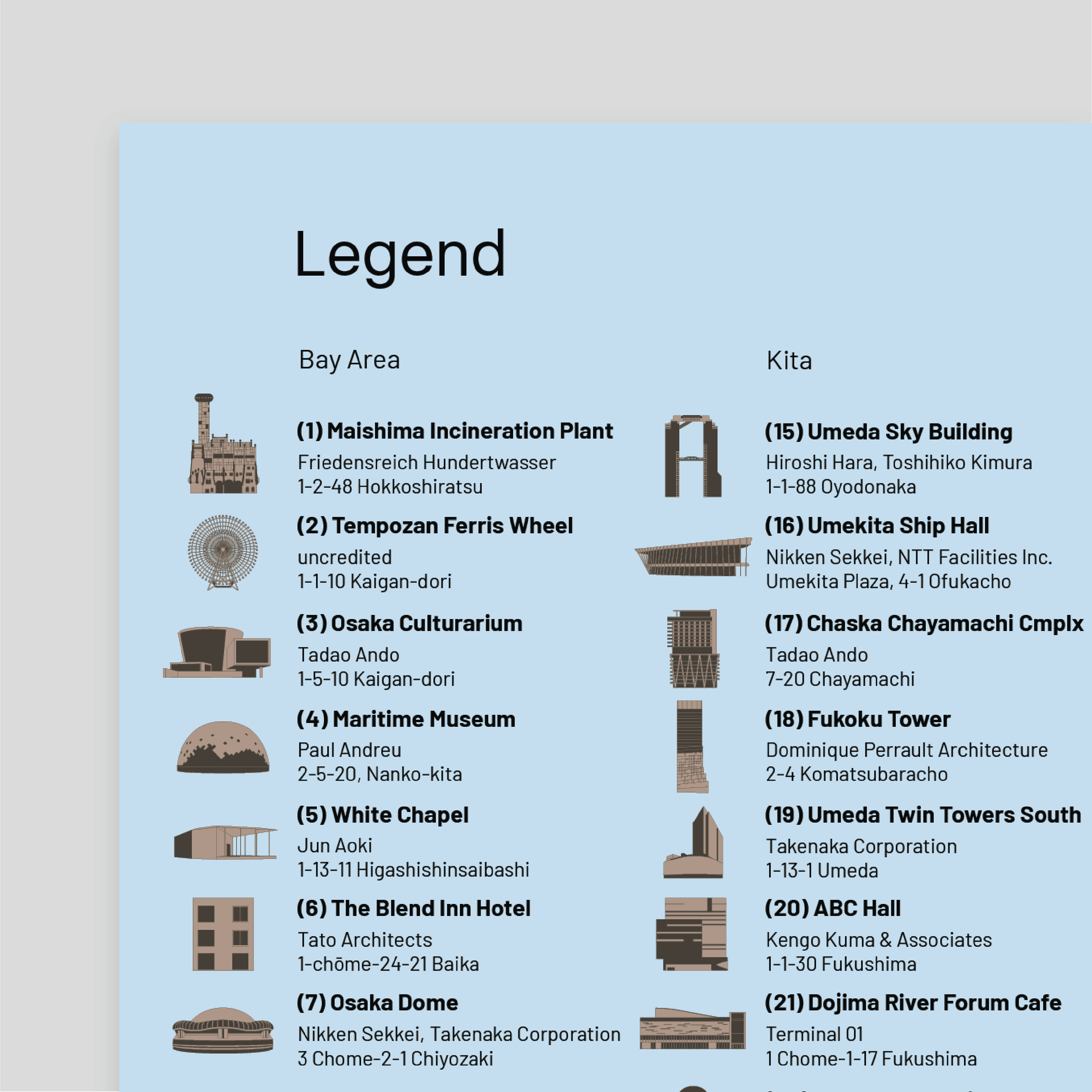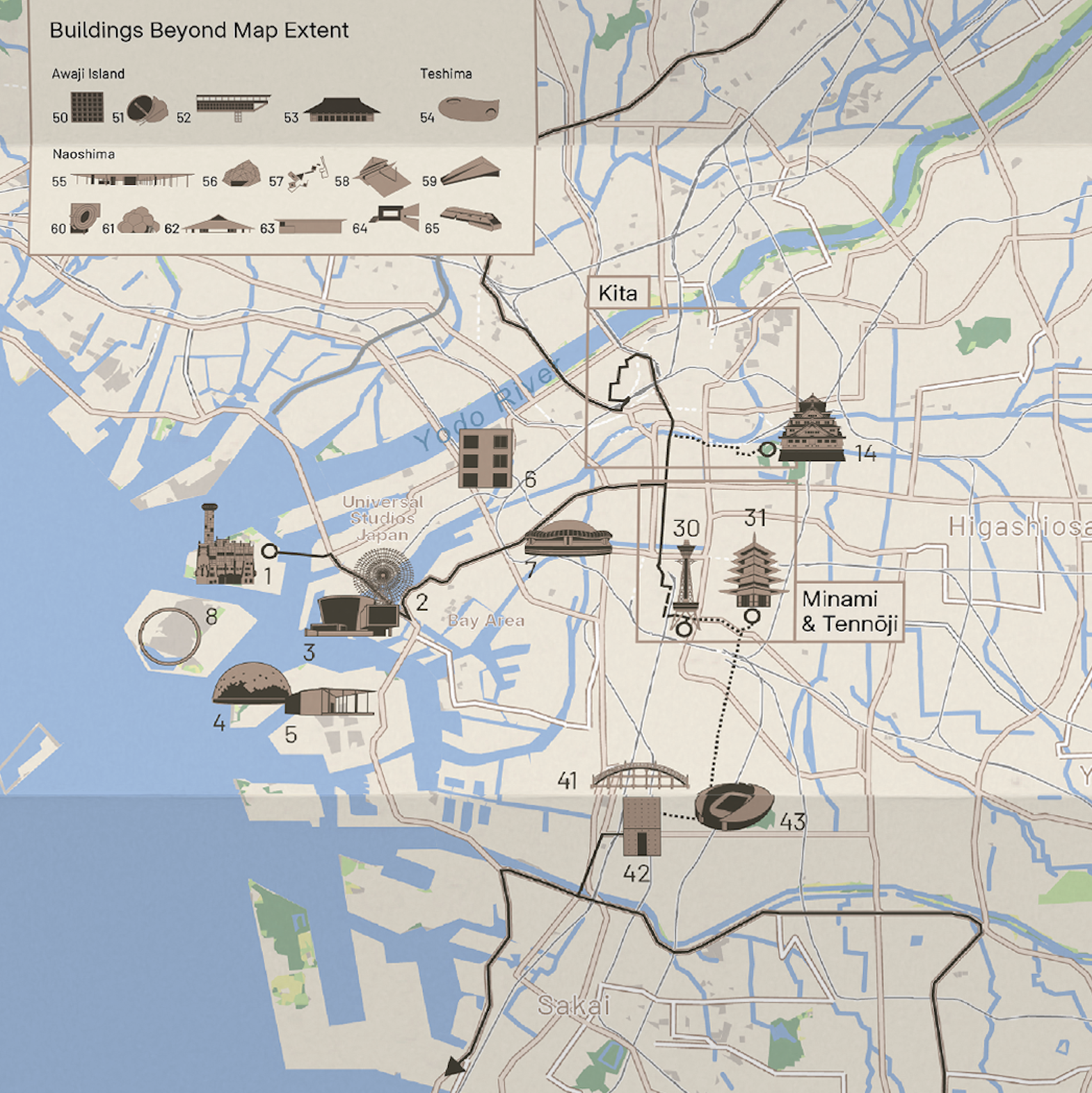 This two-sided folding map features over 60 illustrated building icons, ranging from historic landmarks like the Osaka Castle to contemporary projects by leading architects like Tadao Ando, Kengo Kuima, SANAA, Sou Fujimoto, Shigeru Ban, Nikken Sekkei, Renzo Piano, and many more—perfect for travelers, culture lovers, and urban explorers alike.