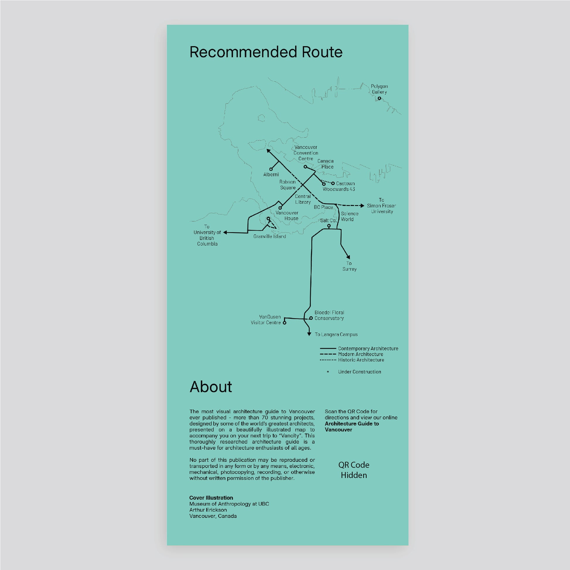 This two-sided folding map features over 70 illustrated building icons, ranging from historic Vancouver landmarks like the Fairmont Hotel, modern masterpieces like the Law Courts and Robson Square by Arthur Erickson and Cornelia Oberlander, to contemporary projects by leading architects like Kengo Kuma, Bjarke Ingles, Norman Foster, Patkau, Bing Thom, and many more—perfect for travelers, culture lovers, and urban explorers alike.