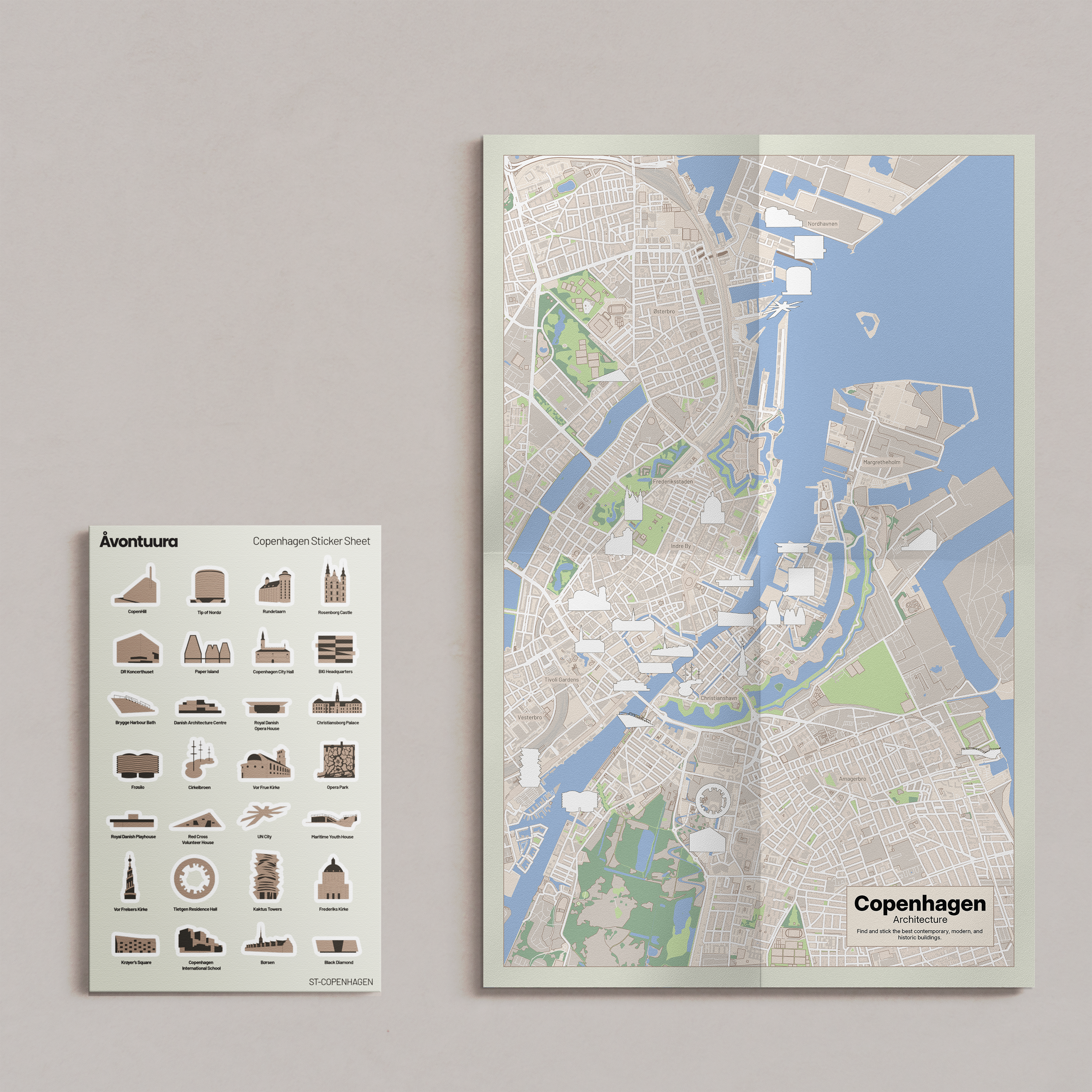 Featuring iconic landmarks like Rosenborg Castle and CopenHill, this sticker & map set offers a fun, creative way to explore the city’s most beloved buildings. Use the stickers to build your own architecture map of the city or enjoy them as creative decoration on notebooks, travel journals and laptops.