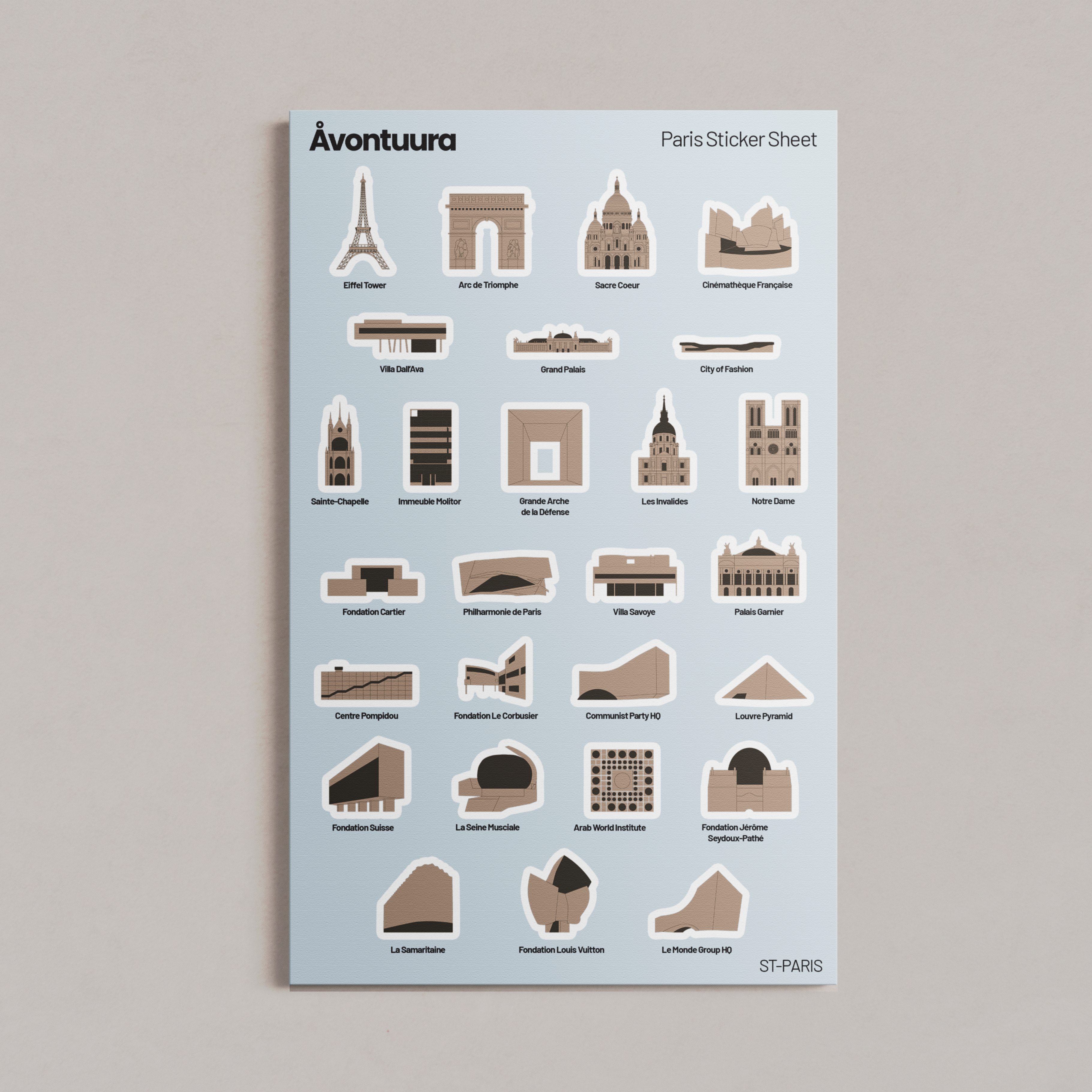 Featuring iconic landmarks like Notre-Dame and the Philharmonie de Paris, this sticker & map set highlights Paris’s contemporary icons, historic monuments, and timeless architectural charm. Use the stickers to build your own architecture map of the city or enjoy them as creative decoration on notebooks, travel journals and laptops.
